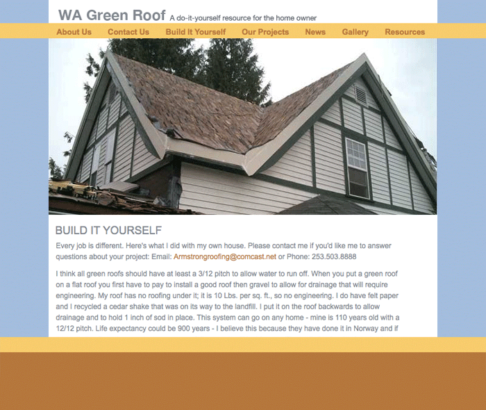 Troy Wagner builds roofs in the Tacoma, Washington area. After 15 years of looking at thousands of roofs he started to notice that the roofs which grew moss on them seemed to stop aging. This insight led him to develop a do-it-yourself method for homeowners who wanted to “enjoy the advantages of having a green roof”. WAGreenRoof.com provides tips, information, and resources for this purpose. View site »